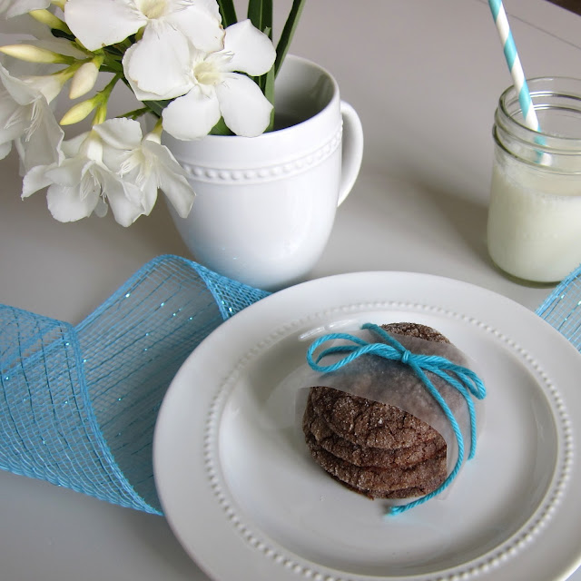 Good Morning!  I was craving sweets and chocolate yesterday, so I baked these cookies on a whim using ingredients I had on hand.  I wasn't planning to share them here, but they were so, so yummy that I whipped out the camera so I could pass along this delicious recipe.  I'm more of a simple cookie lover, like sugar and shortbread cookies.  I'm not a huge fan of really sweet, rich cookies or icing.  So this simple little chocolate cookie has just the right amount of sweetness.  It's soft, chewy, chocolate goodness!  Now on to the recipe.